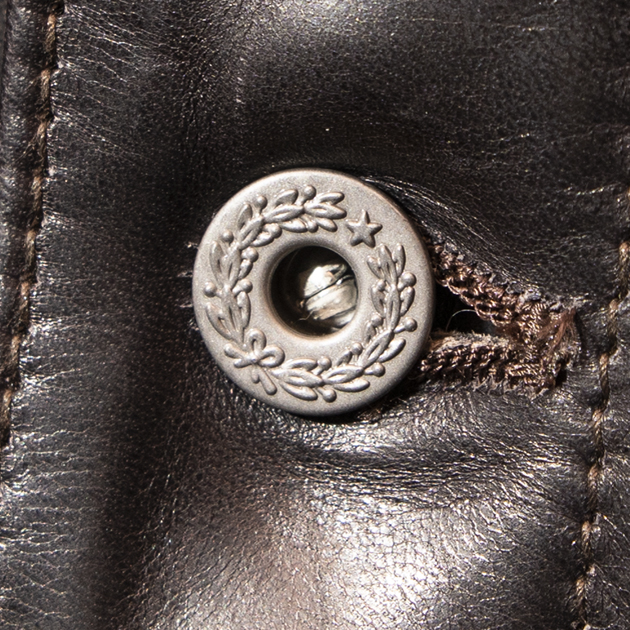 今作においては、これまでドットボタン仕様であったフロントボタンを、ボタンホール仕様とする事で、よりオールドな雰囲気を持たせた。