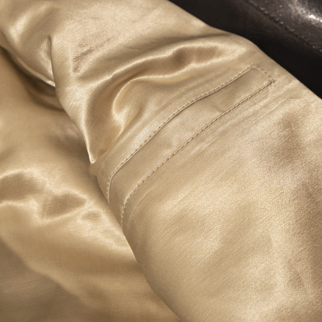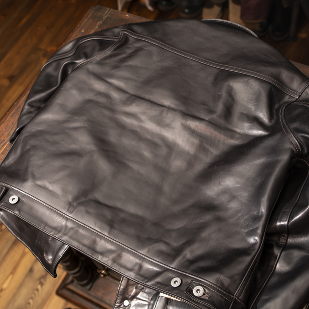 これによって、前身後身の前後差もつけられ、着用時によりレザージャケットらしい収まりを生む事ができる。