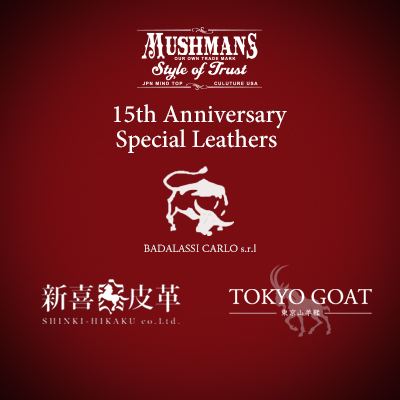 昨年に引き続き、様々なレザーをご用意すると共に、以前よりPRしておりました『MUSHMANS 15th Special Material』に関しても詳しくご説明いたしますので、どうぞ御確認下さいませ<m(__)m>