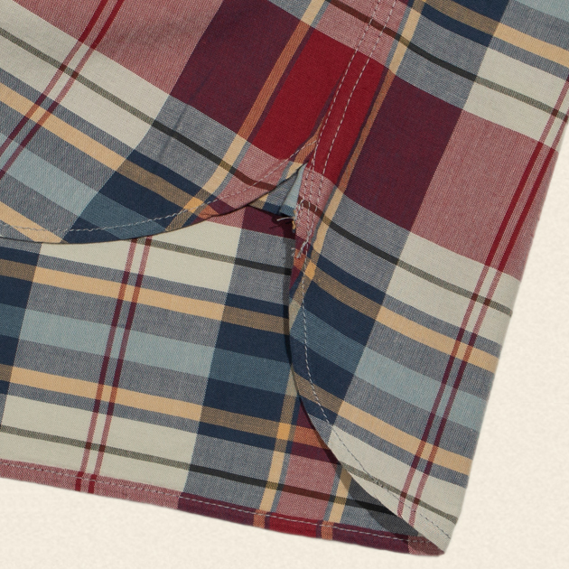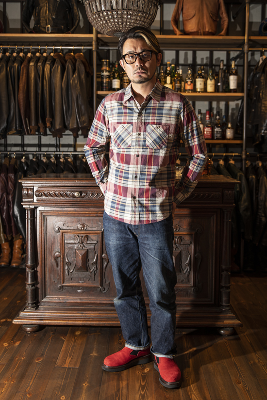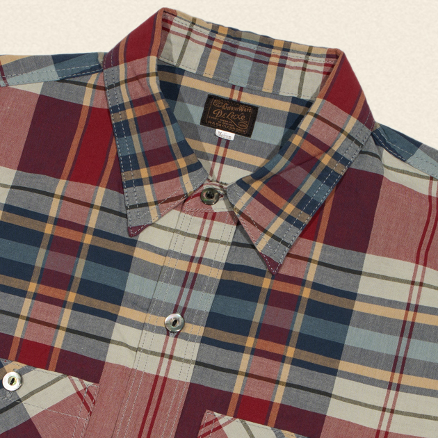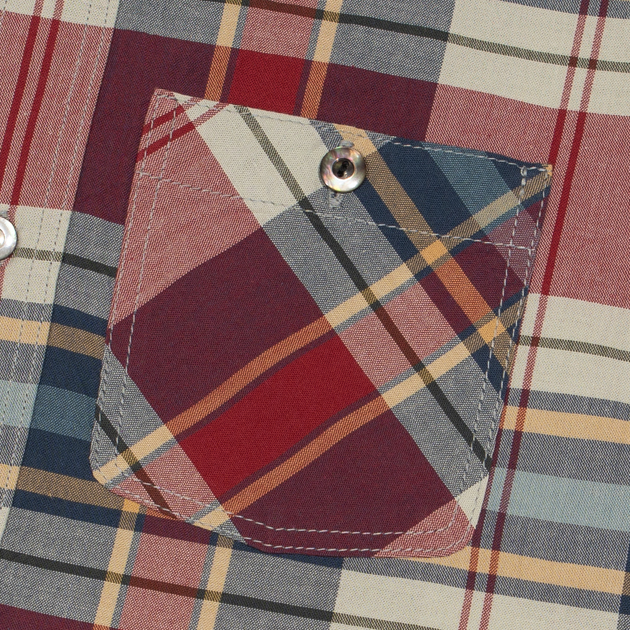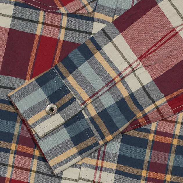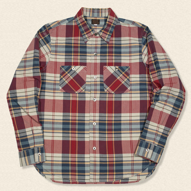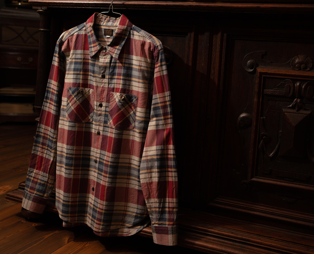 マドラスチェックを彷彿させる柄はインディゴデニムにも、チノパンにもよく似合う配色で日常に使いやすいワークシャツです。