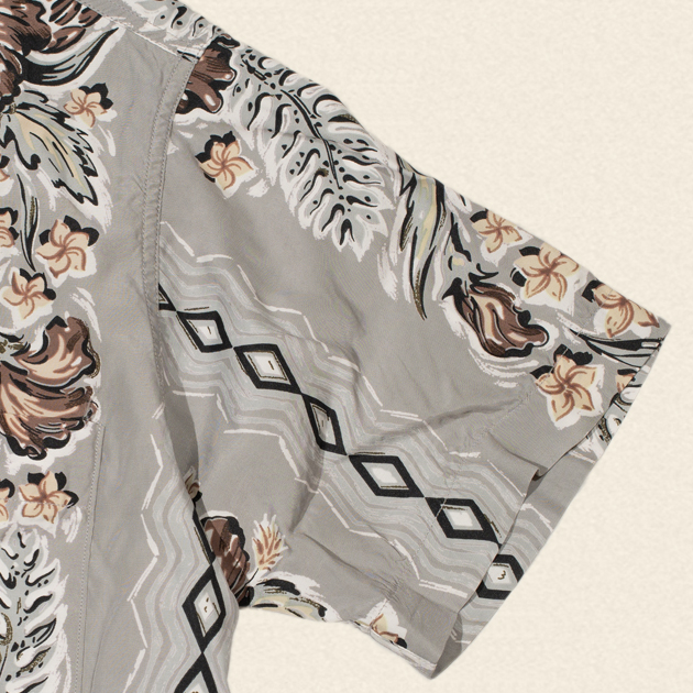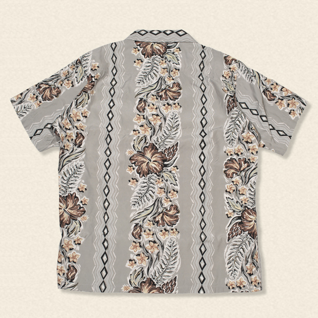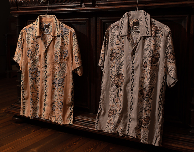 筆で書かれたような和を思わせる絵柄のタッチが、ハワイアンシャツは日本人が着物をシャツに仕立てなおしたという歴史を物語っているかのよう。