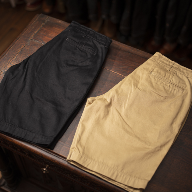 こういったミリタリー系トラウザースをカットオフしたショートパンツは、使い勝手が良く、夏の定番アイテムとして皆様一本はお持ちの事と思いますが、サイズ感と言いシルエットと言い、定番的でありながらも、今まで無かった雰囲気を感じる一本です。