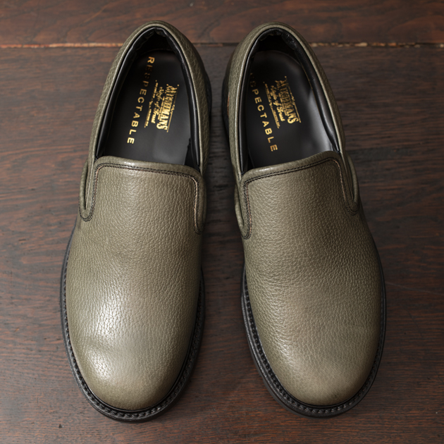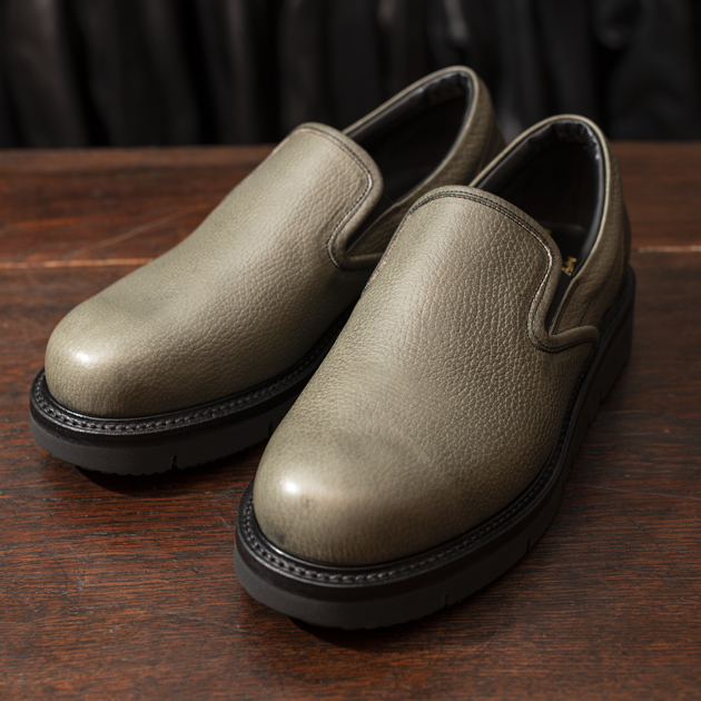 スケーター・サーフシーンは勿論の事、ストリートファッションでも定番のSlip-onタイプのスニーカーを、オールレザーは勿論のこと、ワークブーツ等に用いられるグッドイヤーウェルト製法で作り上げた作品です。