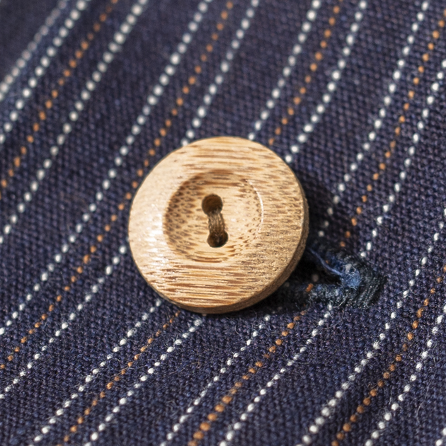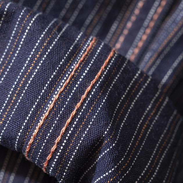 見た目は日本古来の絣を思わせますが、着物に使用するそれと異なり、ヘヴィーなワークウエア用の生地感となっております。