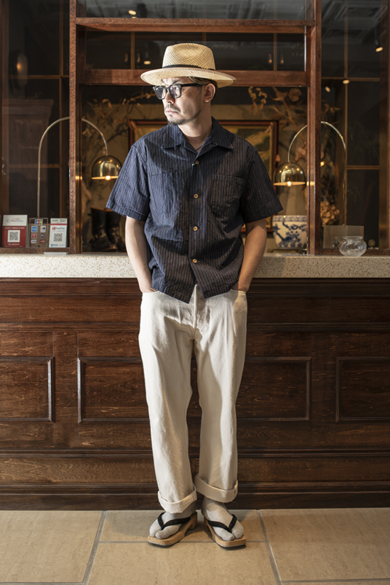 オープンシャツ(開襟シャツ)のディテールとなっており、実に夏らしい襟元を演出。