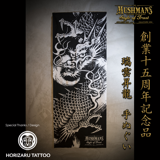 さて、この『MUSHMANS創業十五周年記念"瑞雲昇龍"手ぬぐい』ですが、ご来店いただく皆様と、オンラインショップを御利用いただく皆様に、この15年の感謝を込めてプレゼントいたします。