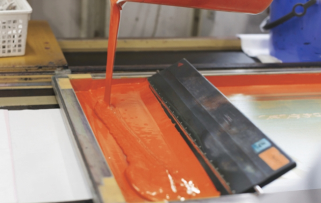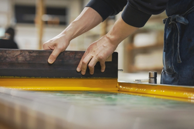 1色ごとに版を作り、色糊をスキージーと呼ばれるヘラで生地に刷り込んでいく手法です。