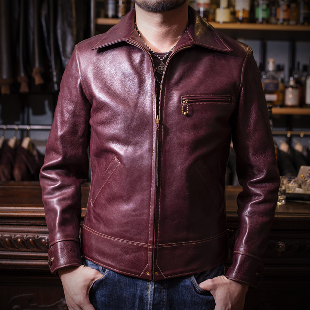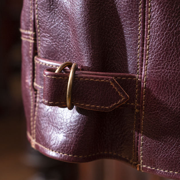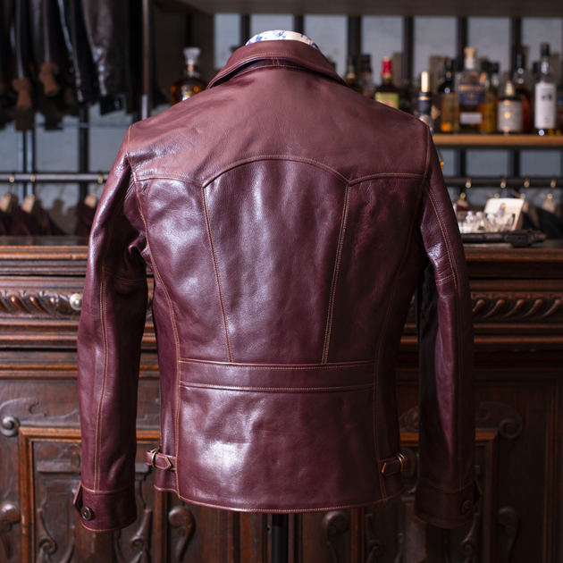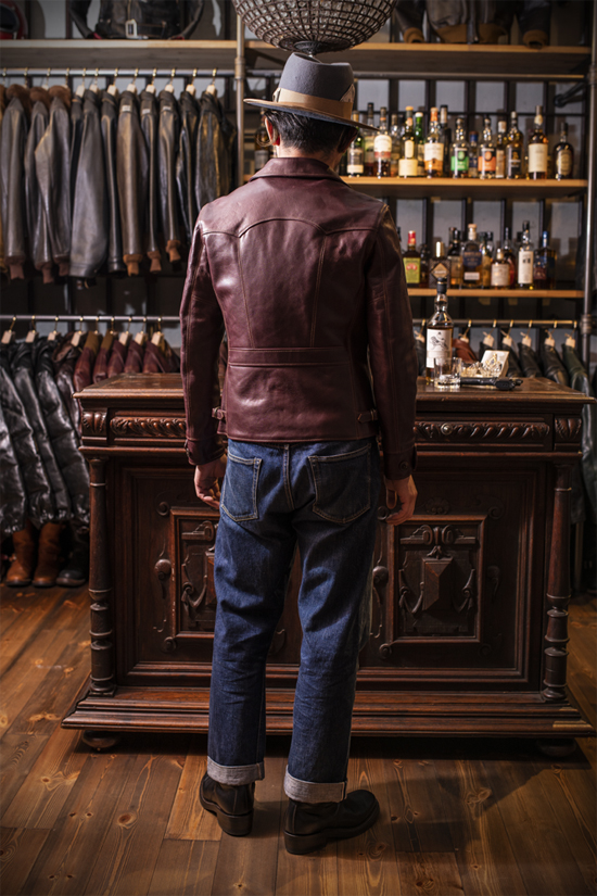 さらに、このバーガンディの発色は、色コーデもし易く、普通のブラウン色のジャケットではコーデが難しい黒色のブーツやシューズでも対応が可能です。