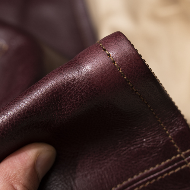 バッファローハイド特有の荒々しいシボ感を活かす為、顔料を一切使用せず、染料のみで仕上げるアニリン仕上げ。