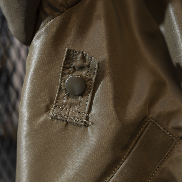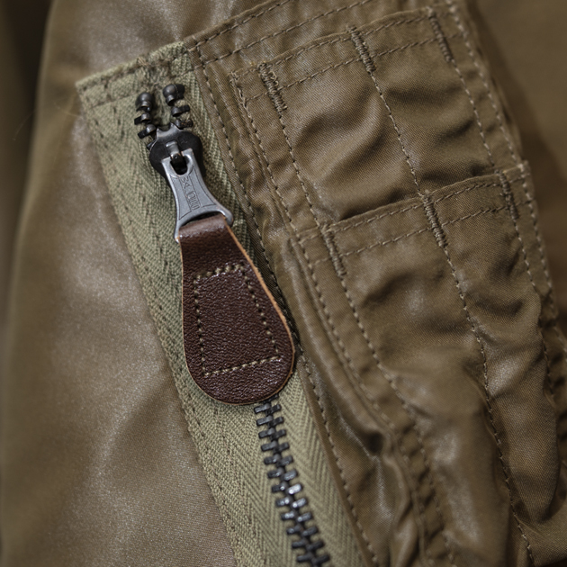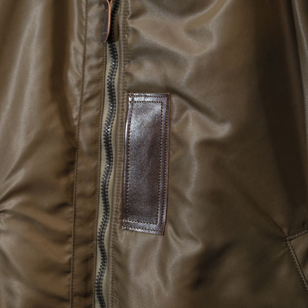 独特のヌメリのある光沢感を発するナイロンツイルのアウターシェルは、当時のB-15Bでも施されていたとされる[シレー加工]を施す事で、濡れたような滑らかな質感を発しております。