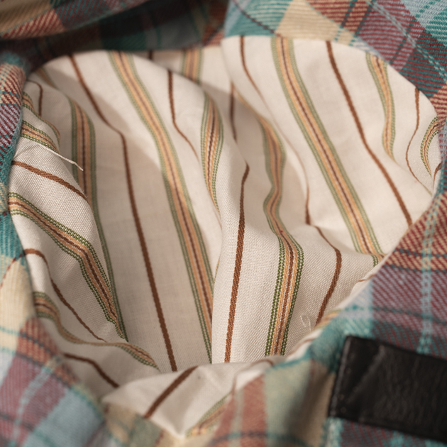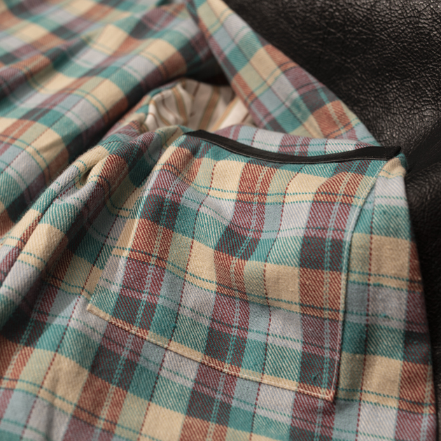 ライニングのチェック生地、ドビーストライプの袖裏共にN.O.S(New Old Stock)ファブリックを使用しております。