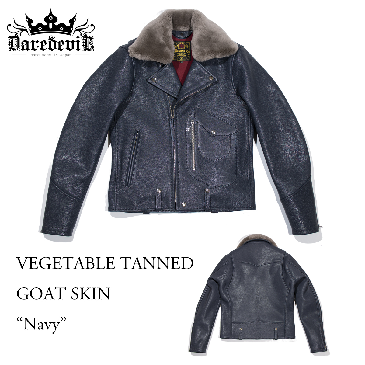 上記仕様と同様のベジタブルタンニンによる銀面の凹凸が独特のオーラを持つゴートスキンと、絶妙なネイビー色の発色が魅力の一着。特にネイビーは革の生産ロット毎に色ブレが大きいものの、丁寧な裁断によって一着の中でパーツ毎に色が変化しないよう充分考慮している。モダンな雰囲気で仕上がるかと思いきや、ヴィンテージテイスト溢れる仕上がりとなった。