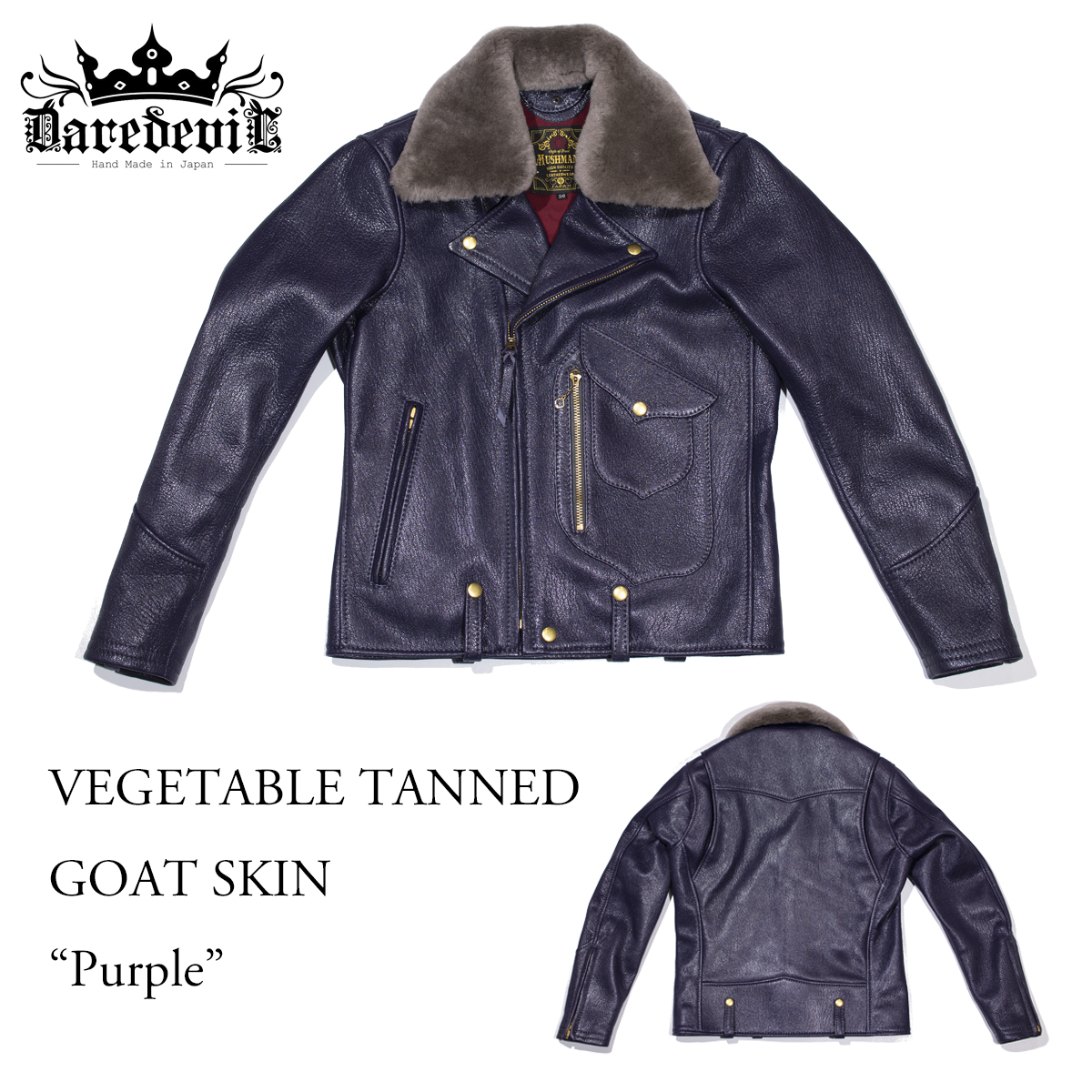 ベジタブルタンニン鞣しのゴートスキンで、極めてアヴァンギャルドなパープル色を採用した一着。