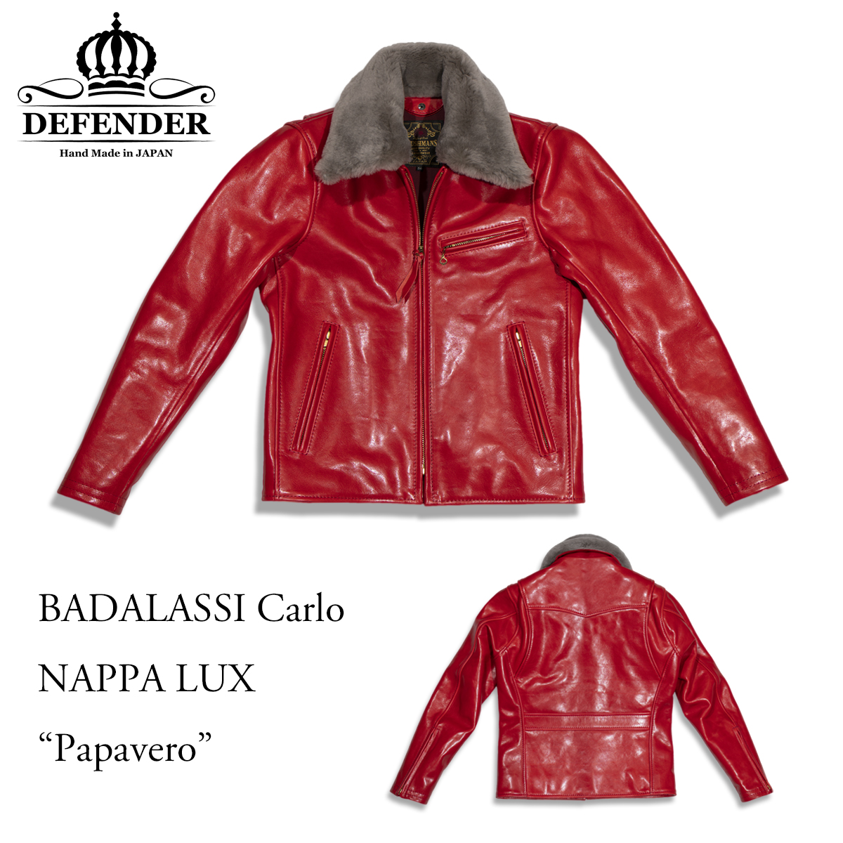 上記モデルと同仕様ながら、ライニングを真紅にする事でライダースらしさを強調した一着。