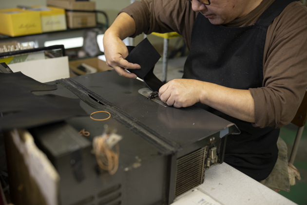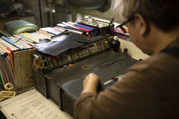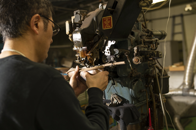 各パーツが重なり合う部分は、このようなマシンを使用し部分漉きを行う。
