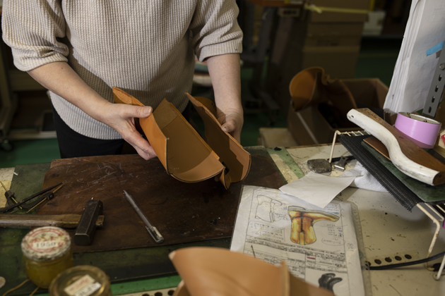 パーツ毎に革厚を変更し、全てが組み上がった際の調和を取る為の作業。
