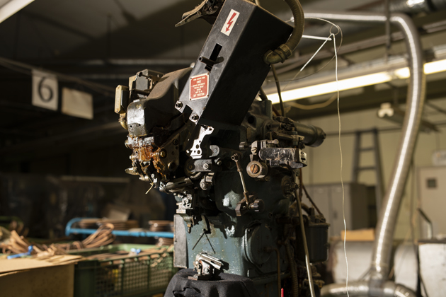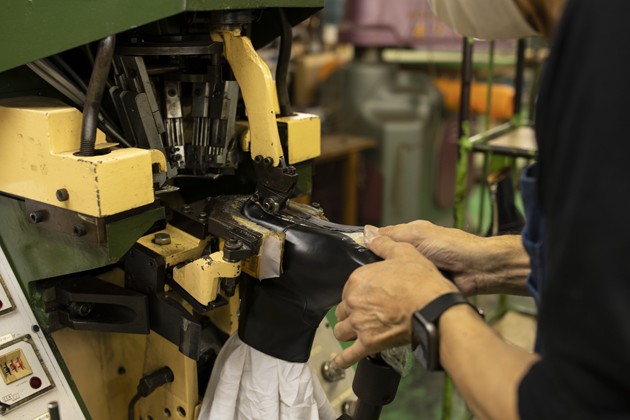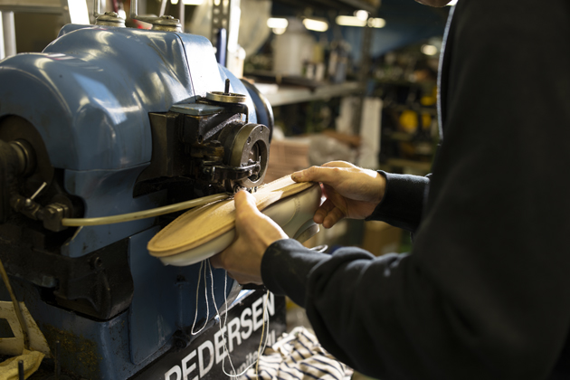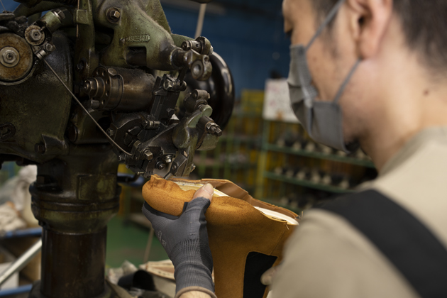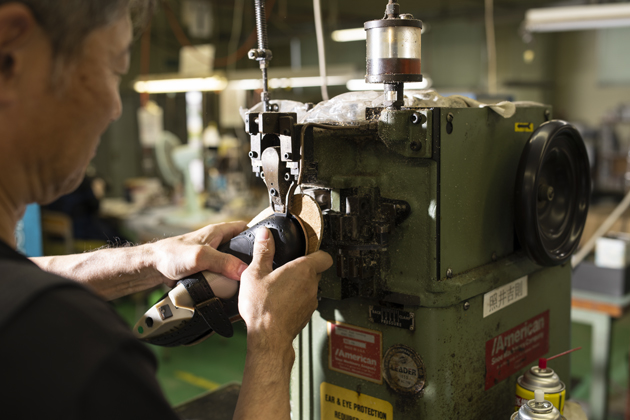 ウェルト・ミッドソール・アウトソールを重ねて縫い付ける為、かなりの厚みとなり、ハイパワーの専用ミシンが使われる。