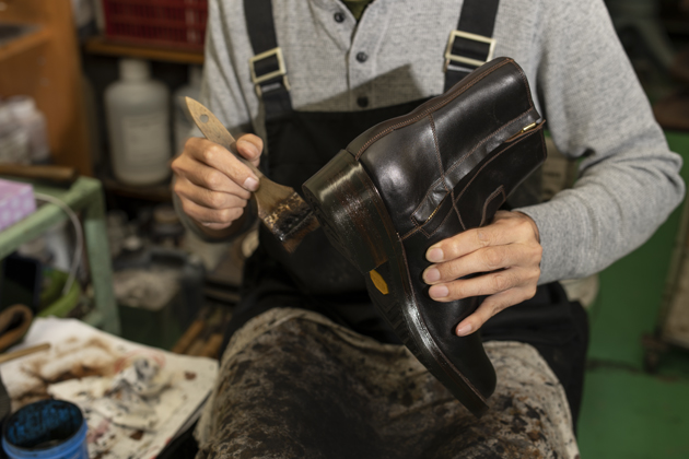 革の特性と相性を見ながら、様々な仕上げ剤を用いて美しく仕上げて行く。