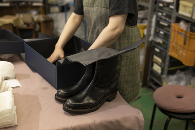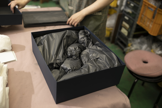 手際良く化粧箱にライスペーパーを敷き詰め、輸送時に靴同士がぶつかり傷が付く事のないように配慮されている。