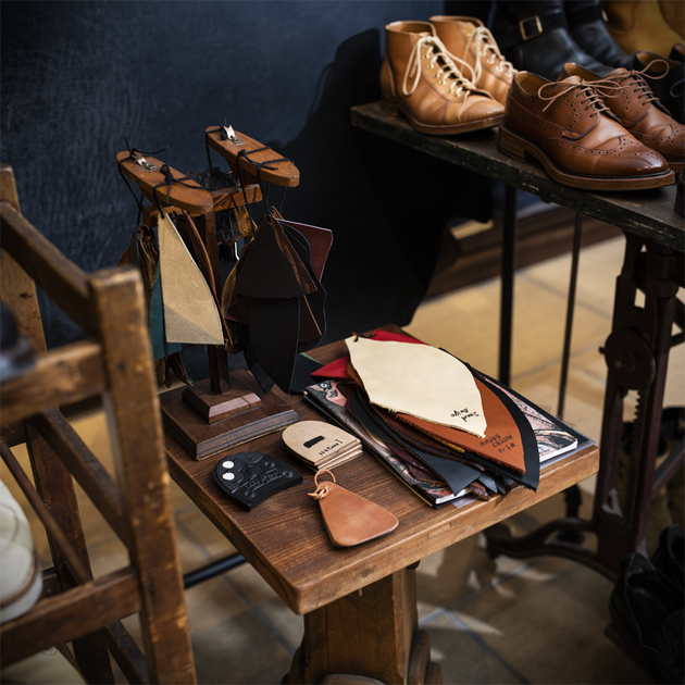 今回目玉のWickett&Craig『Oiled Latigo』を一枚革でご用意し展示しております。