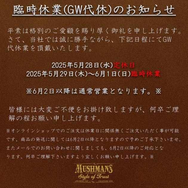 ※オンラインショップでのご注文は休業日に関係無くご注文いただく事が可能 です、商品の発送に関しては6月2日以降となりますので予めご了承下さいませ。 またメールでのお問い合わせに関しましても、6月2日以降のご対応とな ります。何卒ご理解下さいますよう宜しくお願い申し上げます。※