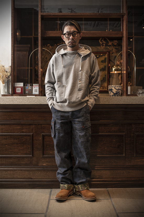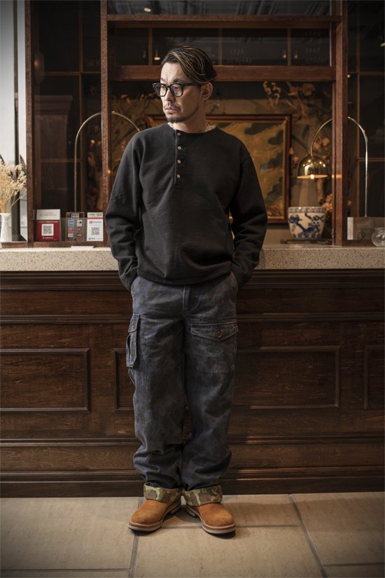 さらにオーバーダイされたダックハンターカモのファブリックで作ったカーゴパンツ。これはファーストコレクションで非常に人気が高かったアイテムの再販。今回は絶対に押さえておきましょう!