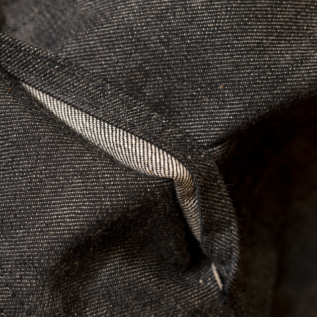 本来はインディゴである経糸に、硫化染料を用いたロープ染色を施すことで、1980年代には無かった「タテ落ちするブラックデニム」を実現させた生地。