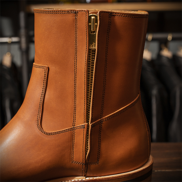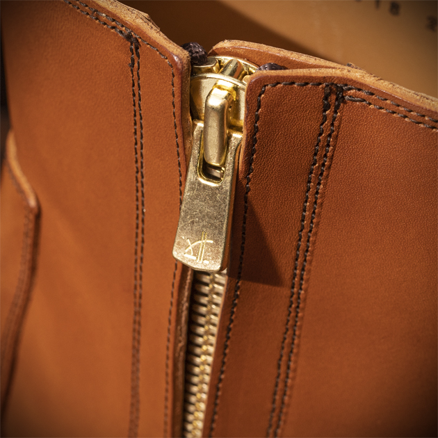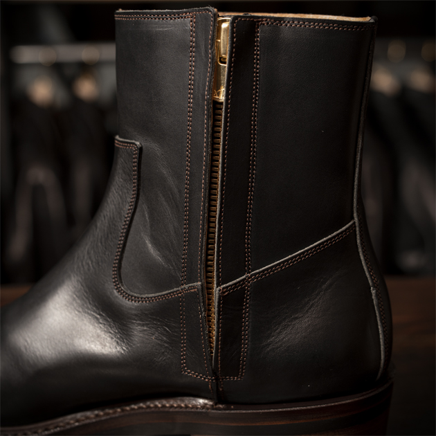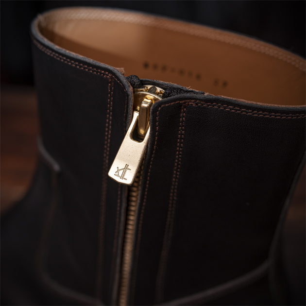 その拘りは、マテリアル・ラスト(木型)だけに留まらず、使用するジッパーパーツや縫製仕様にも及ぶ。