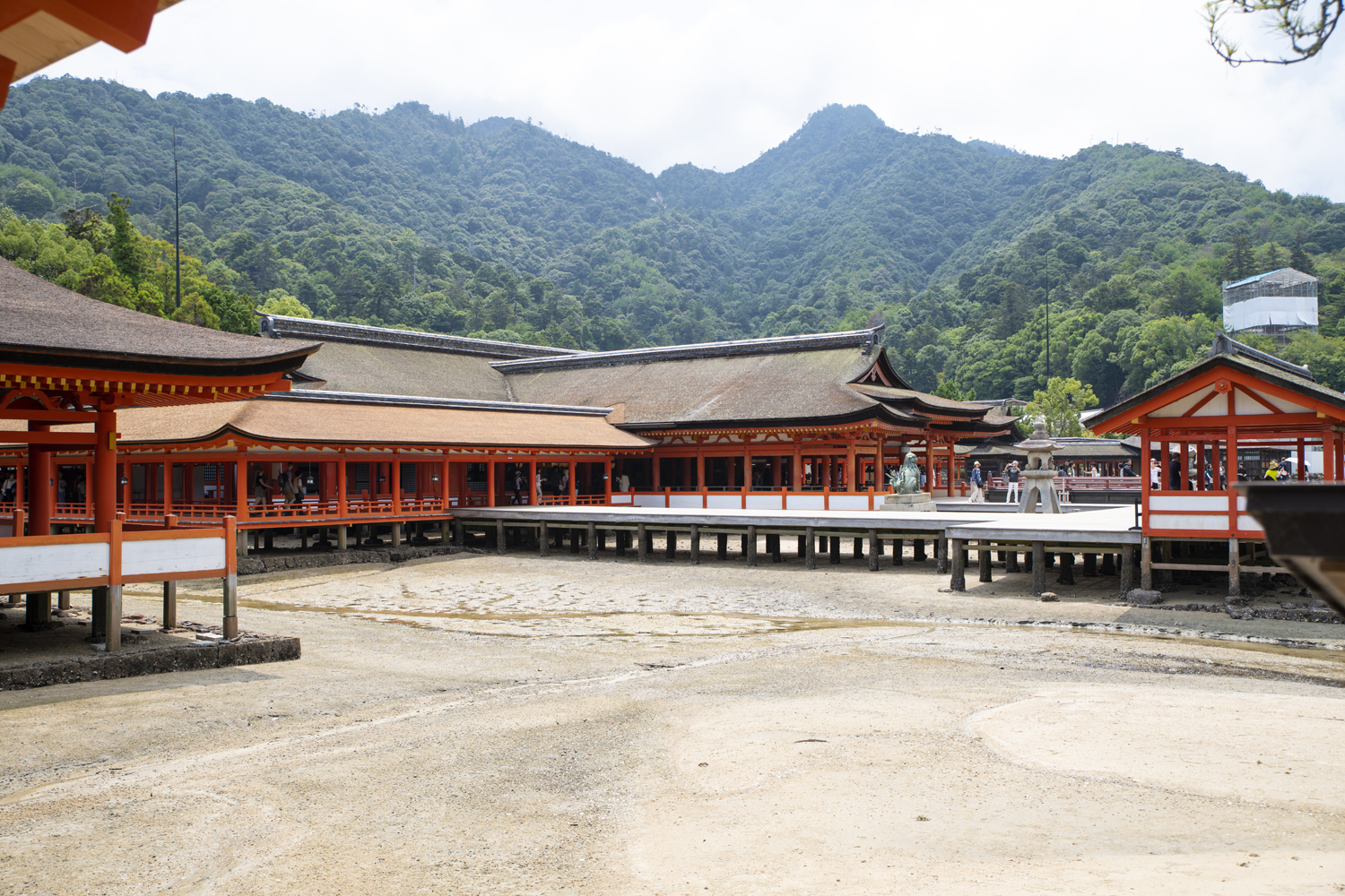 満潮時には回廊や舞台が海に映え、干潮時には大鳥居へと歩いて渡れるなど、潮の満ち引きそのものが神域の景観を形作っています。