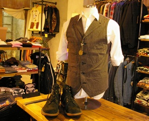 薄手の綿ブロードシャツをゴソゴソっと捲り上げてベストを着る事で、綺麗な感じの中にラフな感じを演出してくれます