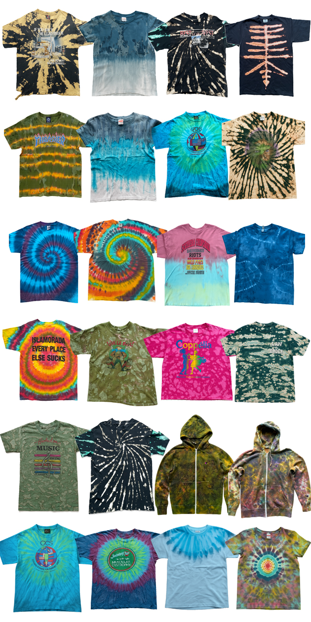 上記サンプル画像の通り、様々な発色、様々なアイテムにタイダイ染めを施す事が可能です。