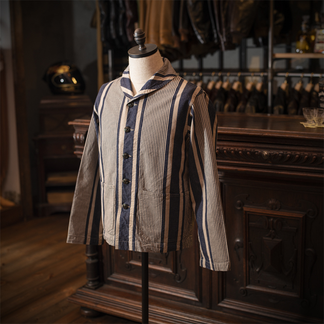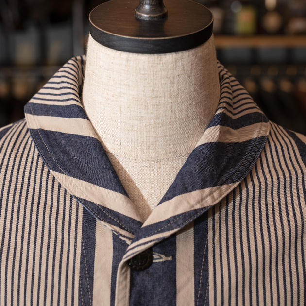 ショールカラーとヒッコリーストライプの組み合わせは、どちらかと言えばカワイイ感じになってしまいがちですが、この生地デザインのおかげなのか?男らしさをも感じるものとなっております。