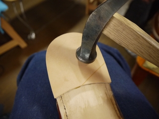 【第九章】のノリでひたすら叩いた後は、革包丁を使い、ヒールの形を本底に合わせ、整えていきます。