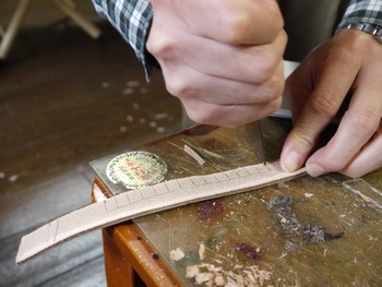 ヒールの大きさに応じて幅を決めカットした革を用意し丸みを帯びさせやすいように切れ込みを入れていきます。