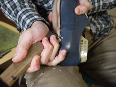 この木釘を打ち込む事により、踵部に縫製が無くして靴を作る事が可能となります。