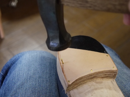 先程の釘よりやや小ぶりの『化粧釘』を、歩行時に擦り減る部分にラバーを用いた『化粧ヒール』に打ち付けていきます。