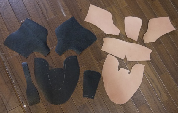今回行うブーツのようにハイトのある靴の場合、足首に掛けてえぐれたデザインとなるので、ライニングのパターン(画像右のベージュ色の革)がアッパー(画像左の黒の革)に比べ複雑な構造となります。