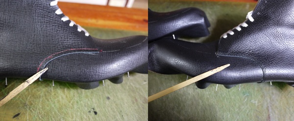 通常でしたらアッパーの革をめくり上げ作業を行うのですが、ハイトが高い場合上手くめくり上げる事が困難な為、少し手間が掛かり、ステッチも安定しなくなってしまいます