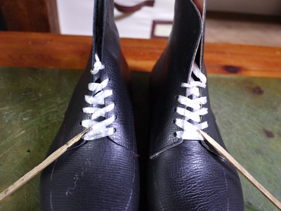 本番で使用するコードバンは皺が入り易い革の為、仮アッパーをいじくりまわして、上手い方法を見つけておく必要があります