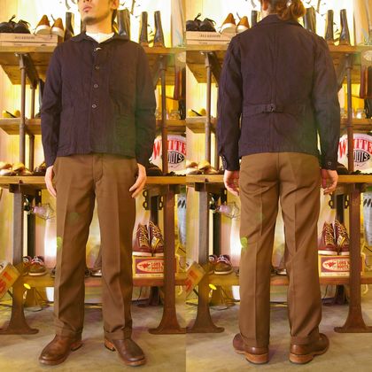 また、シルエットの綺麗なセンタープレスのパンツを持ってくる事で、ワークジャケットらしすぎず着崩しております