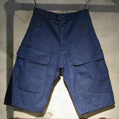 デザインは、フロントポケットにハンティングJKTをモチーフにした大き目のスラッシュポケットとフラップポケットが各2個ずつ付いており、また、ポケットの裏部分や、ウエストの裏部分等には、リネン100%の生地が当てられている為、強度もありながらオールド感のある仕様となっております