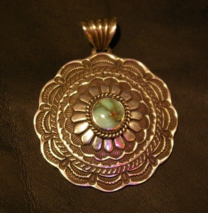 スタンプワーク、エンボス・・惜しみなく施された装飾、センターの目を引くターコイズ(High Grade Natural Ajax Turquoise)は、勿論なのですが、