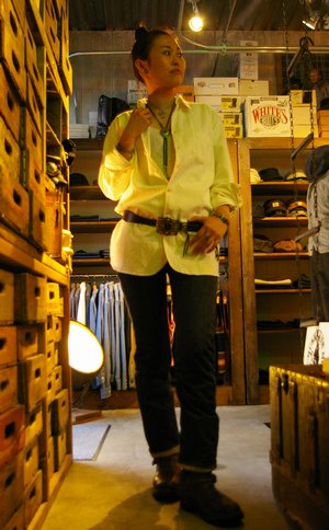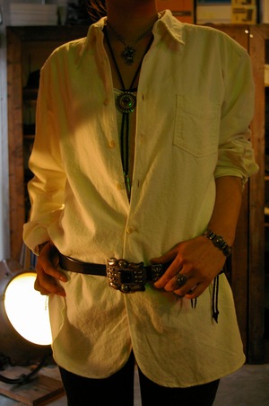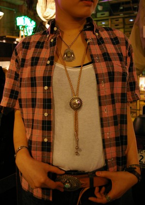 可愛らしいピンクのシャツに合わせて、ちょっと、惚けた印象の(笑)サンダーバードTOPとボウタイを合わせ、腰元を引き締める為にターコイズが美しい、コンチョバックルを着用しました。