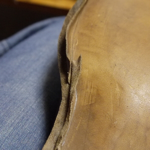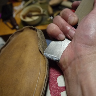 中物(シャンク、コルク)を詰めるのにあたり、余計な段差を無くすべく、まずは余り革をカットします