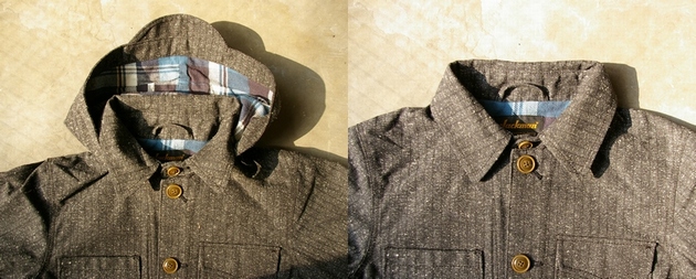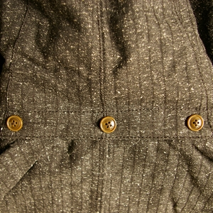 通常ナイロン系のBench Coatは取り外し不可能なものやジッパーでの取り外しのものが多く存在しておりますが、このモデルは、コットンベースの生地の為、雰囲気を崩さぬようボタンでの脱着となっております