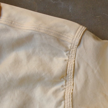 袖や袖ぐり、サイドのシーム部分、バックヨーク等に三本針縫製を使用しており、この縫製を施した繊細な生地に洗いをかける事によって生まれるギャザーがとても良い質感を与えます。