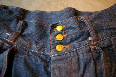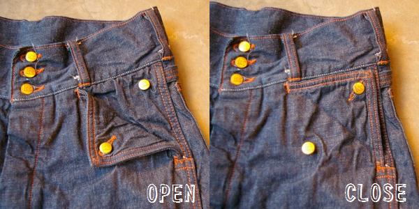 この部分を3つのボタンにする事により、太いベルトを通す事が出来るようにループが大きくなり、また、ウエスト周りのフィット性も向上します。