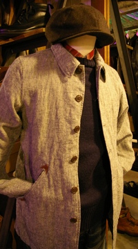 生地は、麻100%シャンブレー素材にクレーター加工を施し表面に凹凸が見えるようにしたものを採用したAward Coat