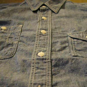 シャンブレーとは、経(タテ)に色糸、緯(ヨコ)に白糸を使用した平織織物で、布面の独特な霜降りの風合いが特徴的なコットン生地の事を言い、さらにこちらは、インディゴ染めとなる為、着用と共に縦落ちやアタリが生まれ、ムラ感の出てくる生地です。
