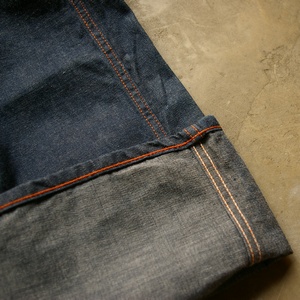サイドのステッチカラーと、裾ステッチカラーを変えて縫製しておりますので、アクセントになり、ロールアップがより引き立ちます